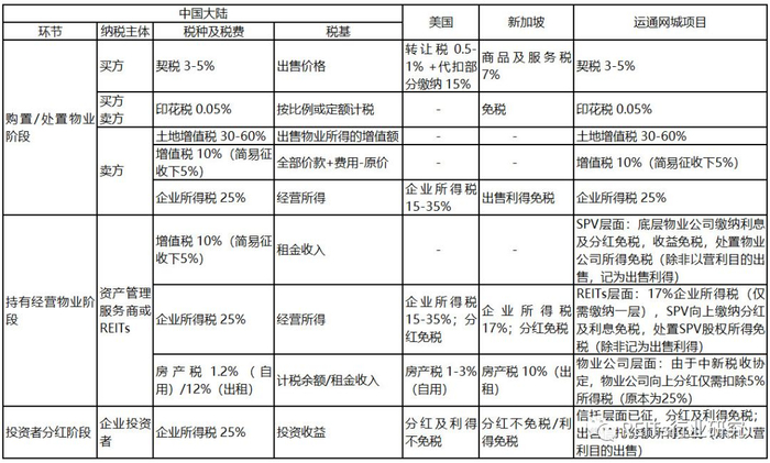 吸引富春集团在新加坡发行REITs的另一大原因无疑是税务优惠,由下表整理可见,虽然在购置处置阶段未有不同,但由于管理主体在新加坡,在持有运营阶段减税优势明显,如项目公司向上分红仅需缴纳5%的所得税(依照中新税收协定约定),而设在新加坡的控股公司几乎不用缴纳税款。于此同时,由于新加坡实行单向计税,在信托层面缴纳所得税后持有者无需再缴纳,避免了设立在国内重复征收的困扰。最为重要的一点,新加坡不对资产增值征税,对资产出售方而言,在将出资成立合伙企业换来的经营型合伙单位的份额在变为REITs股份和现金前,不需要缴纳资产转移的资本利得税。