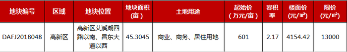 11月30日,高新区艾溪湖周边45亩的地块拍出,南昌高投城市建设开发有限公司拿下,成交楼面价4154元/㎡,住宅限价13000元/㎡。