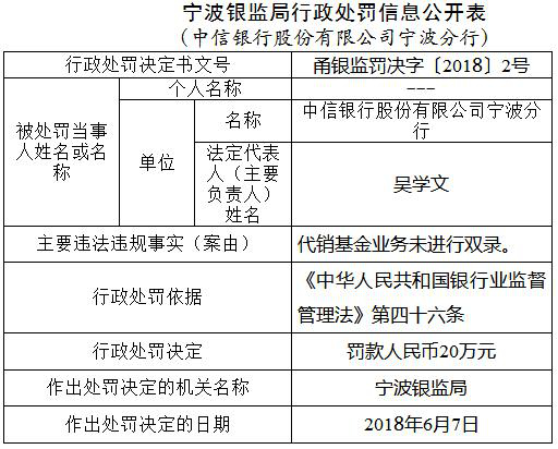 6月22日,银保监会网站公布对中信银行宁波分行的行政处罚决定。中信银行宁波分行代销基金业务未进行双录,被银保监会宁波银监局罚款20万元。