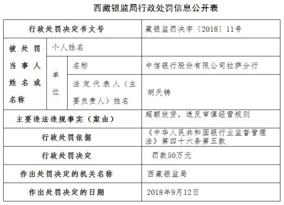 11月11日,中国银保监会官网公布西藏银监局行政处罚信息公开表(藏银监罚决字〔2018〕11号、12号)。因超额放贷,违反审慎经营规则,中信银行拉萨分行被罚款50万元。