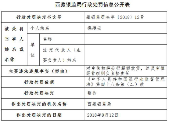 此外,操建安对中信拉萨分行超额放贷,违反审慎经营规则负直接责任,被西藏银监局警告。行政处罚依据为《中华人民共和国银行业监督管理法》第四十八条第(二)款。