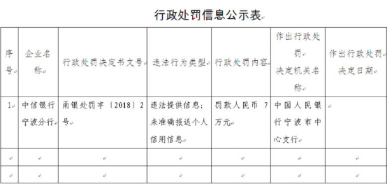 4月19日:中信银行宁波分行违法提供信息 被央行罚款7万元