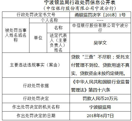 6月22日,银保监会网站公布对中信银行股份有限公司宁波分行的行政处罚决定。中信银行宁波分行贷款“三查”不尽职;受托支付管理不到位、贷款用途不真实、贷款资金未按约定使用,被宁波银监局罚款20万元。处罚依据为:《中华人民共和国银行业监督管理法》第四十六条。