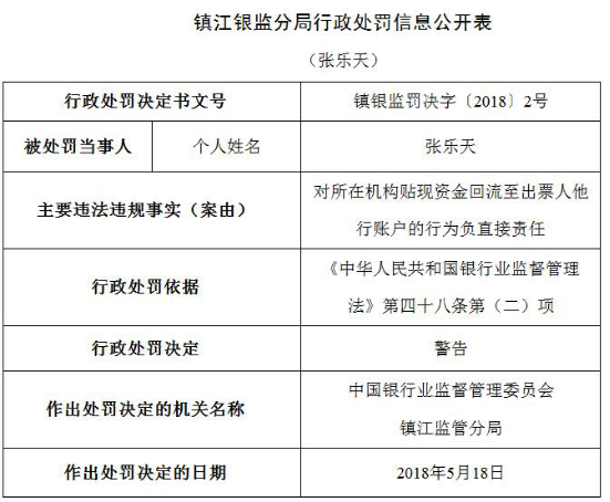 此外,张乐天对所在机构贴现资金回流至出票人他行账户的行为负直接责任,中国银行业监督管理委员会镇江监管分局对其警告。