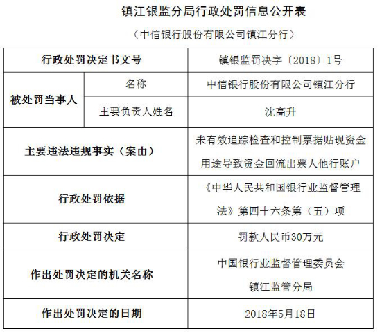 6月8日,银保监会网站披露镇江银监分局行政处罚信息公开表。因未有效追踪检查和控制票据贴现资金用途导致资金回流出票人他行账户,中信银行镇江分行被中国银行业监督管理委员会镇江监管分局罚款人民币30万元。
