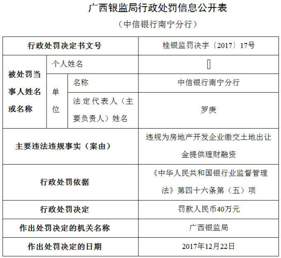 1月12日,银监会网站发布的广西银监局行政处罚信息公开表显示,中信银行南宁分行存在违规为房地产开发企业缴交土地出让金提供理财融资违法违规行为,银监会广西银监局对其罚款人民币40万元。