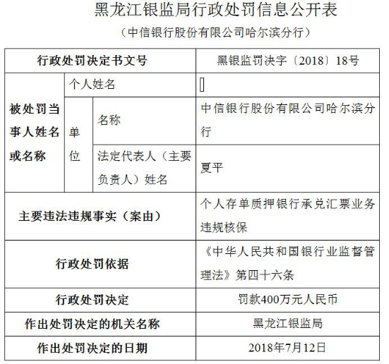 8月3日,银保监会网站公布的黑龙江银监局行政处罚信息公开表显示,中信银行哈尔滨分行因个人存单质押银行承兑汇票业务违规核保,被黑龙江银监局罚款400万元人民币。行政处罚依据为《中华人民共和国银行业监督管理法》第四十六条。