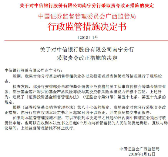 1月15日,广西证监局网站发布公告称,中信银行南宁分行存在安排部分未取得基金销售业务资格的员工从事宣传推介等基金销售业务;并且检查发现部分基金客户购买的基金产品风险等级与其投资者风险承担能力评级不匹配。广西证监局决定对该行采取责令改正措施。