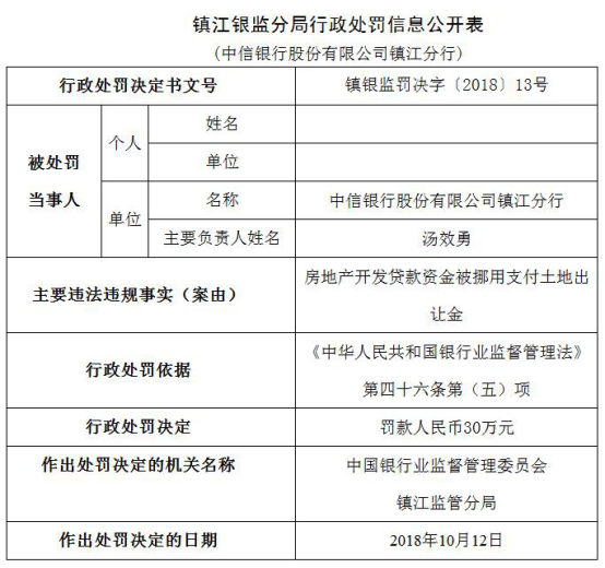 11月9日:房地产开发贷款资金被违法挪用 中信银行镇江分行被罚30万