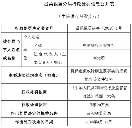 吕梁银监分局依据《中华人民共和国银行业监督管理法》第四十六条对中信银行吕梁支行罚款20万元。