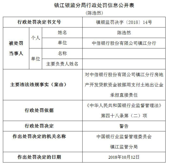 此外,中信银行镇江分行陈浩然对上述事件承担直接责任,被镇江银监分局警告。行政处罚依据是《中华人民共和国银行业监督管理法》第四十八条第(二)项。