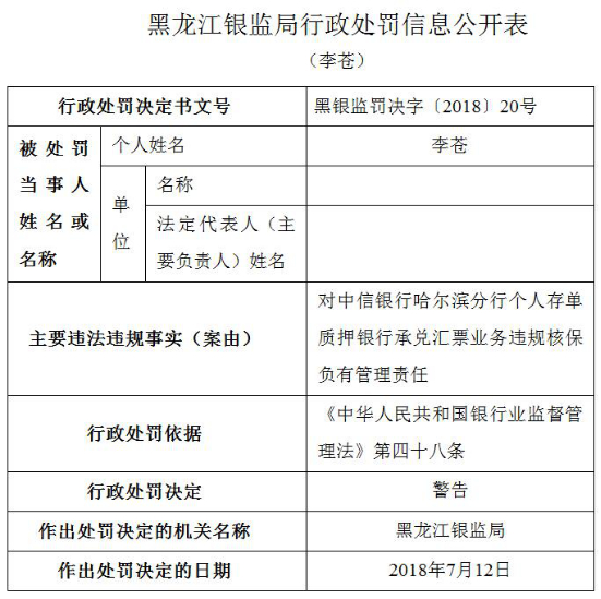 此外,两名相关责任人也收到了罚单。因对中信银行哈尔滨分行个人存单质押银行承兑汇票业务违规核保负有直接责任,张道琚被禁止终身从事银行业工作,李苍被黑龙江银监局警告。行政处罚的依据为《中华人民共和国银行业监督管理法》第四十八条。