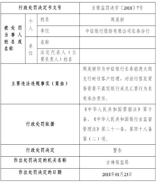 之后,据银监会网站1月26日消息,中信银行长春分行周美妍作为中信银行长春前进大街支行时任客户经理,对该行签发贸易背景不真实银行承兑汇票行为负有承办责任。吉林银监局依据《中华人民共和国票据法》第十条、《中华人民共和国银行业监督管理法》第二十一条、第四十八条第(二)项,对其警告。