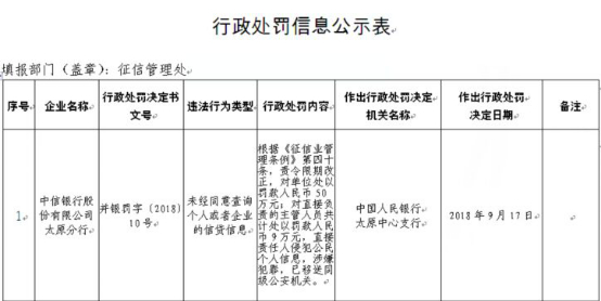 9月21日,中国人民银行太原中心支行网站发布行政处罚信息显示,中信银行股份有限公司太原分行未经同意查询个人或者企业的信贷信息,根据《征信业管理条例》第四十条,责令限期改正,对单位处以罚款人民币50万元;对直接负责的主管人员共计处以罚款人民币9万元,直接责任人侵犯公民个人信息,涉嫌犯罪,已移送同级公安机关。