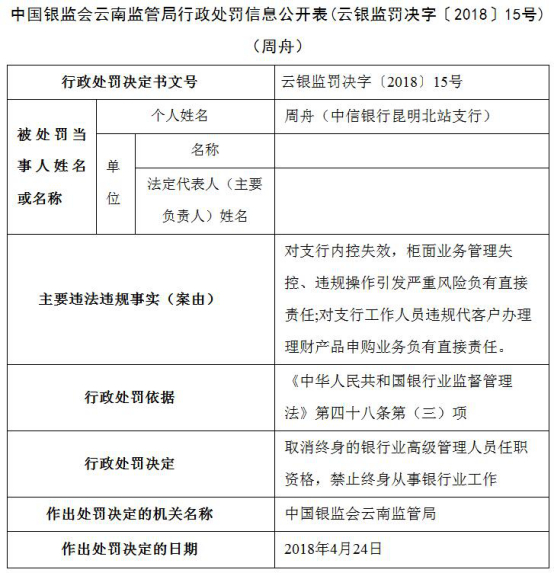 据银保监会5月18日发布的中国银监会云南监管局行政处罚信息公开表(云银监罚决字〔2018〕15号)显示,中信银行昆明北站支行高管周舟对支行内控失效,柜面业务管理失控、违规操作引发严重风险负有直接责任;对支行工作人员违规代客户办理理财产品申购业务负有直接责任。