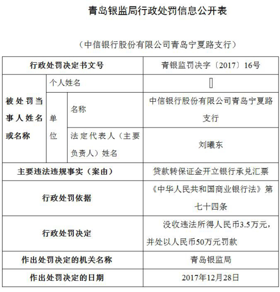 1月19日,据青岛银监局发布的行政处罚信息公开表显示,因贷款转保证金开立银行承兑汇票,中信银行青岛宁夏路支行被没收违法所得3.5万元,并被罚50万元。