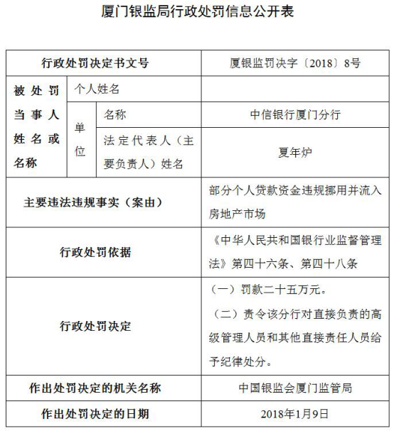 1月25日,银监会网站披露厦门银监局行政处罚信息公开表,中信银行厦门分行部分个人贷款资金违规挪用并流入房地产市场,厦门银监局决定对其罚款25万元,责令该分行对直接负责的高级管理人员和其他直接责任人员给予纪律处分。