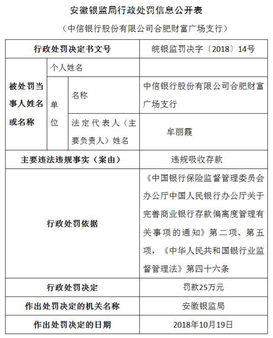 11月1日:中信银行合肥财富广场支行违规吸收存款被罚25万