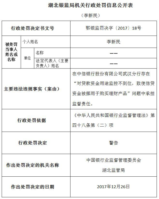 1月19日,湖北银监局机关公布的鄂银监罚决字〔2017〕18号行政处罚公开表显示,中信银行武汉分行存在“对贷款资金用途监控不到位,致使信贷资金被挪用于购买理财产品”违法问题,李新民为中信银行武汉分行这一违法行为承担监督责任。湖北银监局根据《中华人民共和国银行业监督管理法》第四十八条第(二)项,对李新民予以警告。