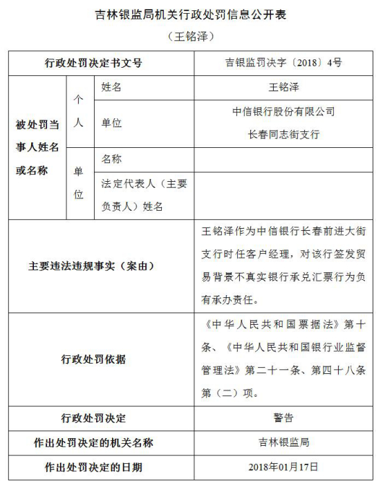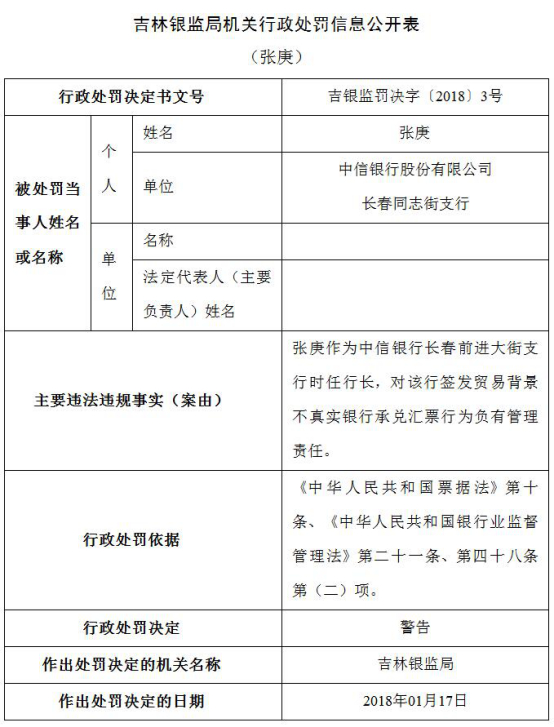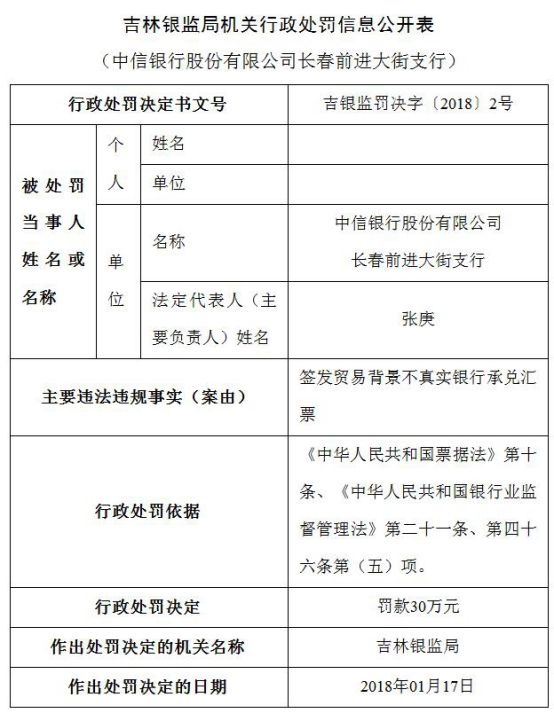 1月24日,据吉林银监局公布的行政处罚信息公开表显示,因签发贸易背景不真实银行承兑汇票,中信银行长春前进大街支行被罚款30万元。此外,时任该支行行长的张庚、时任该支行客户经理的王铭泽也分别收到了罚单,被警告。