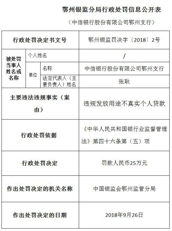 10月18日,中国银保监会官网公布鄂州银监分局行政处罚信息公开表(鄂州银监罚决字〔2018〕2号)。中信银行鄂州支行违规发放用途不真实个人贷款,被鄂州银监分局罚款人民币25万元。