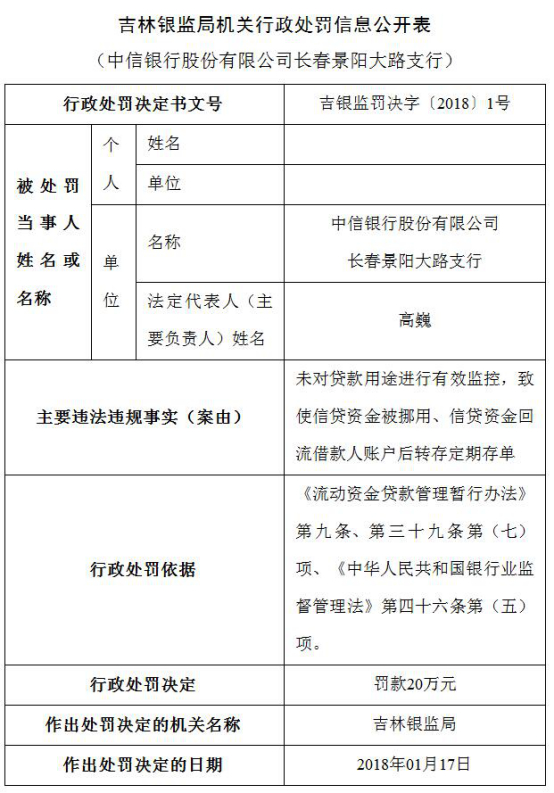 1月24日,吉林银监局公布机关行政处罚信息公开表。因未对贷款用途进行有效监控,致使信贷资金被挪用、信贷资金回流借款人账户后转存定期存单,中信银行长春景阳大路支行被罚款20万元。