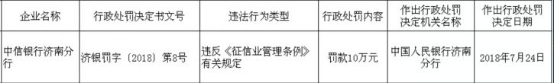 7月31日:中信银行济南分行违反征信业管理条例 遭央行罚款10万元