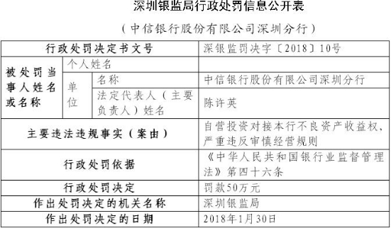 2月26日,深圳银监局公布的行政处罚信息公开表(深银监罚决字〔2018〕10号)显示,中信银行深圳分行自营投资对接本行不良资产收益权,严重违反审慎经营规则。深圳银监局根据《中华人民共和国银行业监督管理法》第四十六条,对中信银行深圳分行罚款50万元。