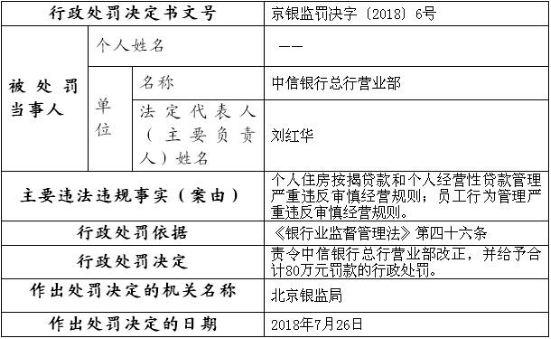 8月10日,北京银监局在银保监会官网公布的行政处罚信息公开表(京银监罚决字〔2018〕6号)显示,中信银行总行营业部个人住房按揭贷款和个人经营性贷款管理严重违反审慎经营规则;员工行为管理严重违反审慎经营规则。