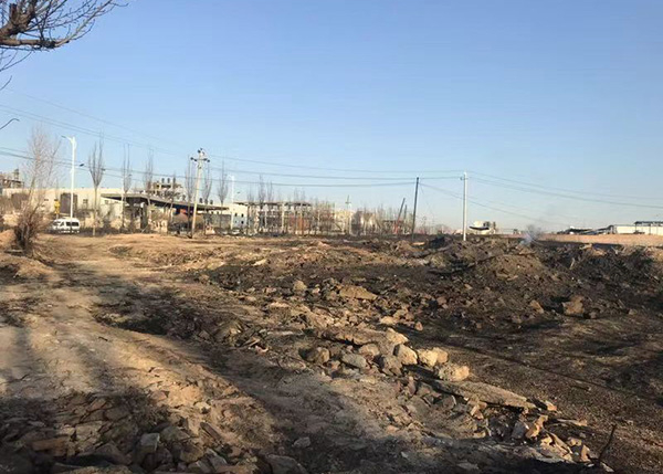 此时,距离梅家营村500米左右的荒林地里,地面焦黑,杂草燃尽,几个村民蹲在烧焦的土地上,望向盛华化工有限公司。