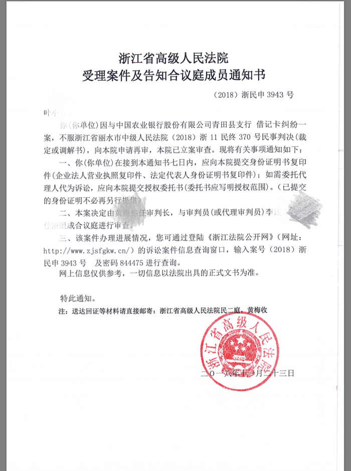 浙江高院的再审受理的受案告知书