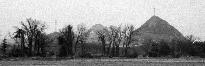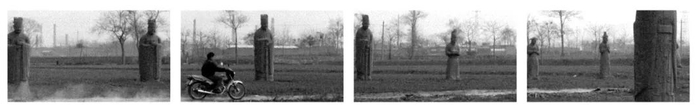 我在《神道》中拍摄的是位于河南巩县的北宋永泰陵,即宋哲宗赵熙的陵墓。我站在距离神道约200米的距离,在两侧分别拍了一张照片,然后把天和地裁掉,并把画面分隔开,一张张地放入册页的两面里——一面展现了从西边看到的神道,另一面则是从东边。而且在其中一张照片中,正好有一辆摩托车经过,非常有趣。