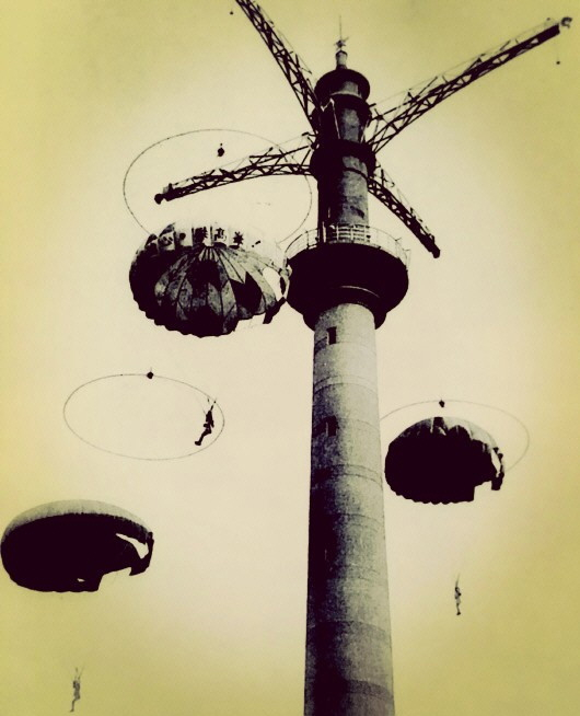 我在1963年参加跳伞运动时听教练说,全国有十三座跳伞塔,济南伞塔以六十多米的高度排在第三。塔上有四极钢臂,可供四人同时跳伞(高度排第二的那座塔虽比济南伞塔稍高几米,但仅有三根钢臂)。钢臂离地四十多米,降落伞最高可升到四十三米。那些年,因为全国运动会有伞塔跳伞比赛,再加上可以为飞机跳伞进行初级训练,所以很多省市开展了伞塔跳伞运动。有的省市有跳伞队而无跳伞塔,就到外地借训,济南跳伞塔曾接待过多次。