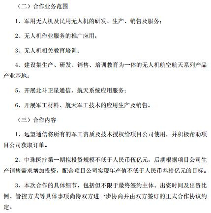 对于此次合作,中珠医疗表示,意向书的签订是公司根据自身发展需要,拟调整战略规划,布局包括但不限于无人机产业链等相关军工业务,将现有优势资源进行整合,在夯实医疗医药大健康产业的前提下,探索新项目可行性,培育公司新的盈利增长点。