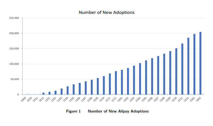(图1显示,在观察周期内,每月新接受支付宝的消费者数量。可以看到,从2010年10月开始,新接受支付宝的消费者总数稳步增长。2013年,新接受支付宝的消费者人数增长至204547人,占样本的13.3%。这表明移动支付正越来越普及。)