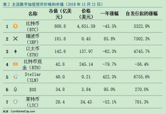 2018年11月,比特币现金社区由于技术及商业分歧形成两派,双方各持有相当的算力和数字加密货币,进而爆发所谓算力战争,造成比特币现金硬分叉为两条互不认可的分支,引发投资者恐慌,以比特币为首的数字加密货币再次破位下行(见图2)。这次事件对整个数字加密货币乃至区块链的发展或产生深远影响,算力垄断对区块链的去中心化本质形成拷问。