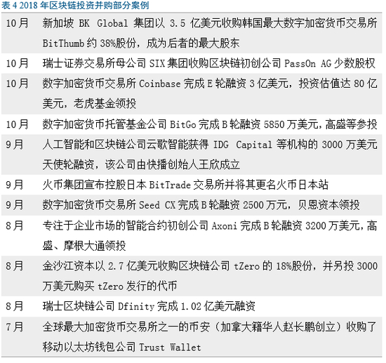 2018年区块链并购交易数量飙升,摩根大通证券公司指出截至 10 月 15 日至少 115 笔,较2017年47笔、2016年16笔明显增加,另一方面这些交易的金额总体较小,大多不足1亿美元。[12]部分投资并购交易见表4。