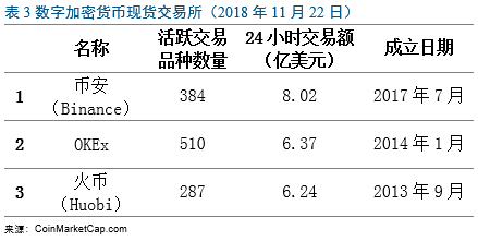 数字加密货币交易所分为现货交易所与衍生品交易所。主流交易所大多位于东亚和美国,例如位于日本的币安、香港的OKEx和Bitfinex、新加坡的火币、韩国的Upbit和BitThumb、美国的Bitstamp和Bittrex等。交易额排名前三的现货交易所见表3。最大的衍生品交易所是BitMEX,其主要交易品种为比特币美元期货,24小时交易额达29.8亿美元。