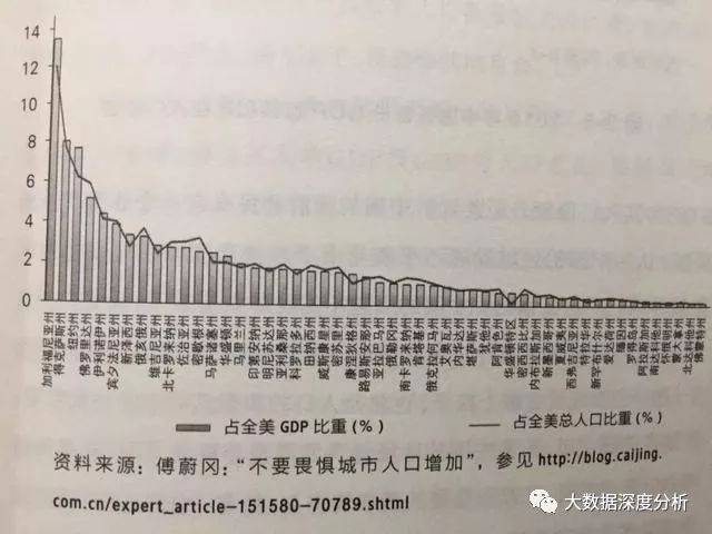 美国的人口和经济聚集程度远高于中国。下图是美国各州的GDP份额和人口份额,柱状图是美国各州GDP在全美占据的份额,曲线则是各州人口在全美的份额。尽管两个份额各自的地区间差距很大,但两者之间却高度一致。很简单的算术就可以告诉我们,各州人均GDP几乎是一样的。因为有的地方集中人口发展工业和服务业,有的地方地广人稀,就搞规模化农场……