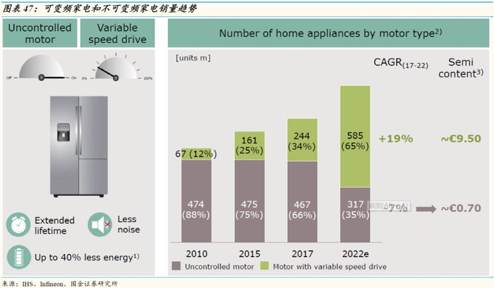 IHS统计,2017年全球家用电器销量约7.11亿台,其中4.67亿台为不可变频家电,占比达到66%,而可变频家电数量为2.44亿台,占比为34%。预计到2022年可变频家电销售量将达到5.85亿台,占比达到65%,17-22年销售量CAGR为19.1%,而不可变频家电销售量将下降至3.17亿台,占比减少至35%。