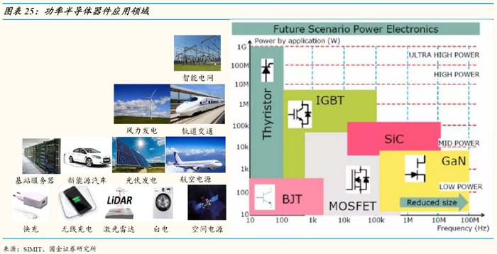 功率半导体器件可用于几乎所有的电子制造业,其下游应用非常广泛,包括新能源(风电、光伏、电动汽车)、消费电子、智能电网、轨道交通等,根据每个细分产品的物理性能不同(主要是针对高频和高功率两大性能),不同的功率器件(MOSFET、IGBT、SiC等)可以应用于不同的领域。