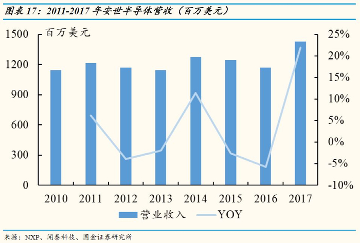 安世半导体自2010-2016年来,营收始终保持在12亿美金左右,但是2016年被中国资本收购后,2017年营收提升至14.27亿美金,同比增长22.0%。
