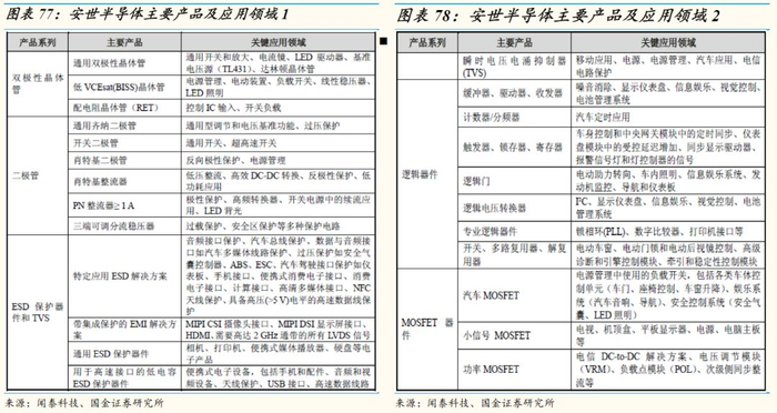 安世半导体产品主要分为分立器件、逻辑器件和MOSFET器件,具体涉及双极性晶体管、二极管、ESD保护器件和TVS、逻辑器件、MOSFET器件五类产品,其主要产品及其用途如下。