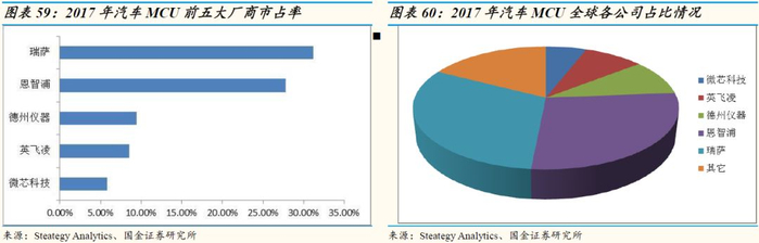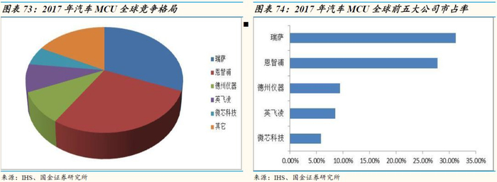 随着汽车电动化和智能化的不断发展,MCU在汽车中的应用不断增多,传统燃油车发动机只需一颗MCU,到了混动,会增加到4颗,纯电动会增加到6-7颗。瑞萨电子在汽车MCU领域优势非常明显,2017年,全球市占率达到31.2%,排名第一。