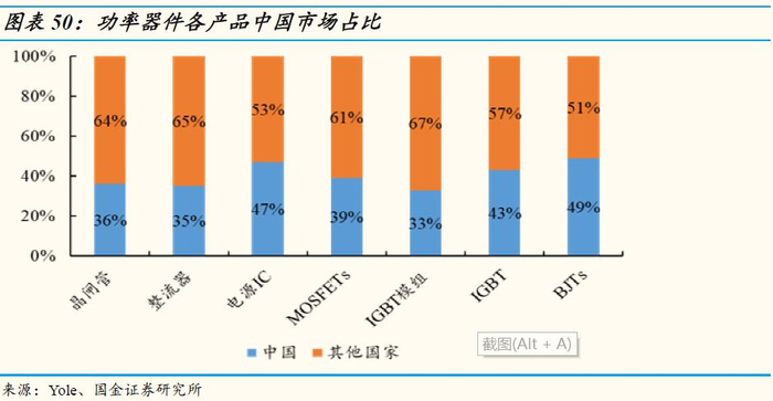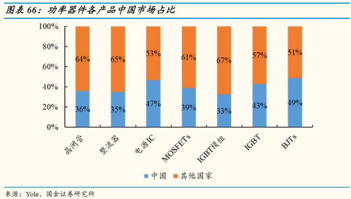 中国功率器件市场占比全球达40%:中国是全球最大的功率器件消费国,功率器件细分的主要几大产品在中国的市场份额均处于第一位。其中,MOSFET中国市场规模占比全球为39%,IGBT为43%,BJT为49%,电源管理IC为47%,其他如晶闸管,整流器,IGBT模组等等产品中国市场占比均在40%左右。