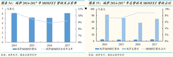 瑞萨电子MOSFET的营收及市占率均出现了下滑的趋势,2014年全球市场占有率为10.5%,2016年下滑到了8.9%,2017年略有提升,为9.3%,但比2014年还是下滑了很多。