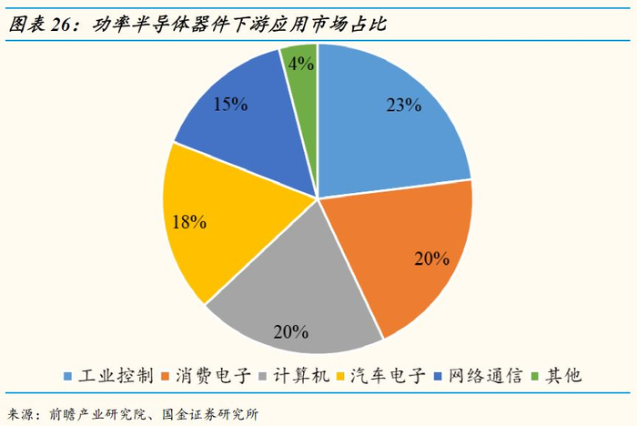 功率半导体器件按照下游应用领域,主要可以分为五大类,包括工业控制(市场占比约为23%),消费电子(20%),计算机(20%),汽车电子(18%),网络通信(15%)。