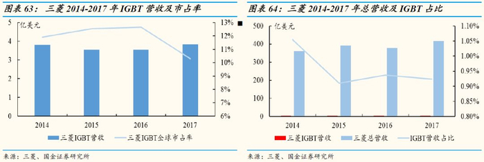 日本三菱IGBT的市占率也有下滑的趋势,2014年市占率为11.9%,2017年下滑到了10.3%。