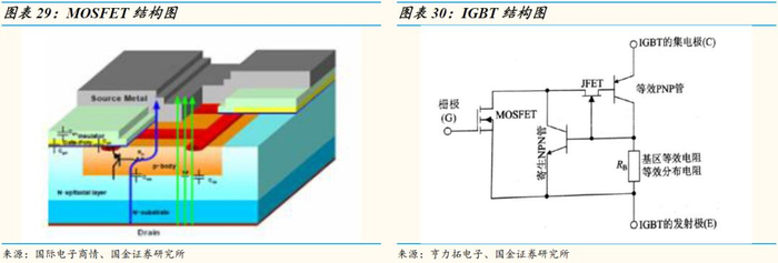 IGBT:IGBT全称绝缘栅双极晶体管,它是由BJT和MOSFET(组成的复合全控型电压驱动式功率器件。IGBT是在VDMOSFET基础之上演化发展而来的,结构十分相似,主要不同之处是IGBT用P+衬底取代了VDMOS的N+衬底,形成PNPN四层结构,正向导通时J1结正偏,发生一系列反应,产生PN结电导调制效应,从而有效降低了导通电阻和导通电压,增大了IGBT的流通能力。IGBT具有电导调制能力,相对于功率MOSFET和双极晶体管具有较强的正向电流传导密度和低通态压降。IGBT稳定性比MOSFET稍差,强于BJT,但IGBT耐压比MOSFET容易做高,不易被二次击穿而失效,易于高压应用领域。