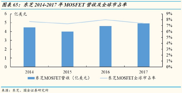 东芝的MOSFET业务全球市占率也略微出现了下滑,2014年为7.7%,2017年下滑到了7.3%。